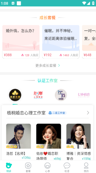 3. 向下滑动页面还可以看到不同的套餐信息和认证的工作室和心理咨询师信息;