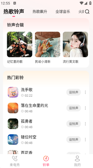 3. 点击页面下方的‘铃单’,即可看到热歌彩铃、热歌飙升、全球音乐等分类;