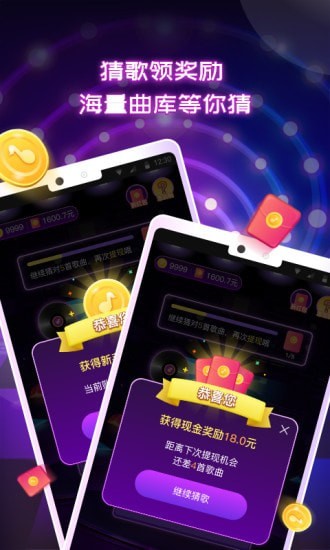 1、含有歌曲播放功能,可通过听歌曲猜歌名,猜对可获得奖励;