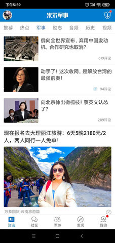 首页根据用户兴趣偏好(如关注特定国家、军种、装备类型)推送定制化的图文、视频资讯,支持用户订阅特定话题。