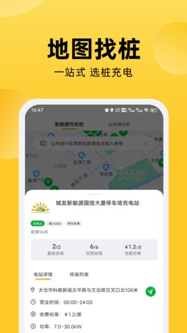 通过搜索省市名称,快速查找充电桩,支持按接口和支付方式筛选显示。