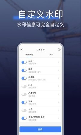 可设置项目名称、拍摄时间、施工区域、工作内容、参会人数、宣传语、天气、地点、海拔、经纬度等
