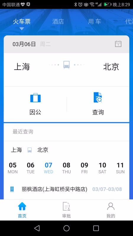 2、进入首页进行查询,机票、酒店、火车票、审批管理等板块都有;