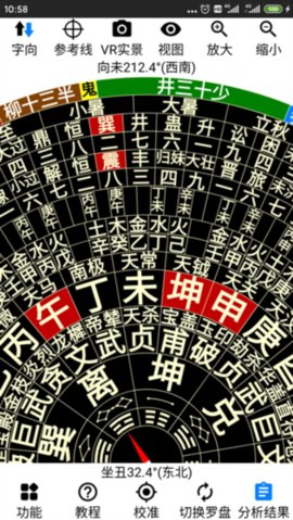 4、摆放罗盘后一键分析八宅布局、九宫飞星、流年,自动辨别天医、生气、延年、伏位、五鬼、六煞、祸害、绝命等方位。点击“VR实景”后自动为真实场景添加方位属性标签。