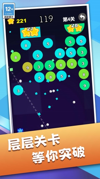4、发射前先观察弹球轨迹,利用反弹机制瞄准带有数字的星星方块,优先击碎这类高价值目标,同时借助弹球弹射扩大破块范围。