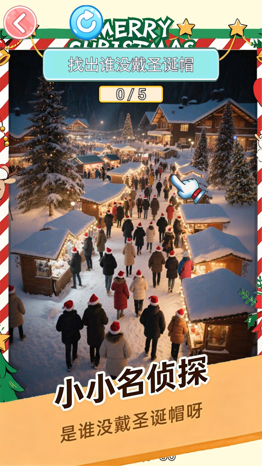 1、玩家要找出场景中没戴圣诞帽的人物,点击对应人物就能进行标记,快速完成找茬任务。