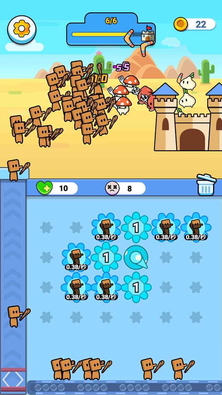 3、合成升级齿轮提升召唤效率,解锁新类型小兵,通过战斗让小兵积累经验、升级技能并装备道具。