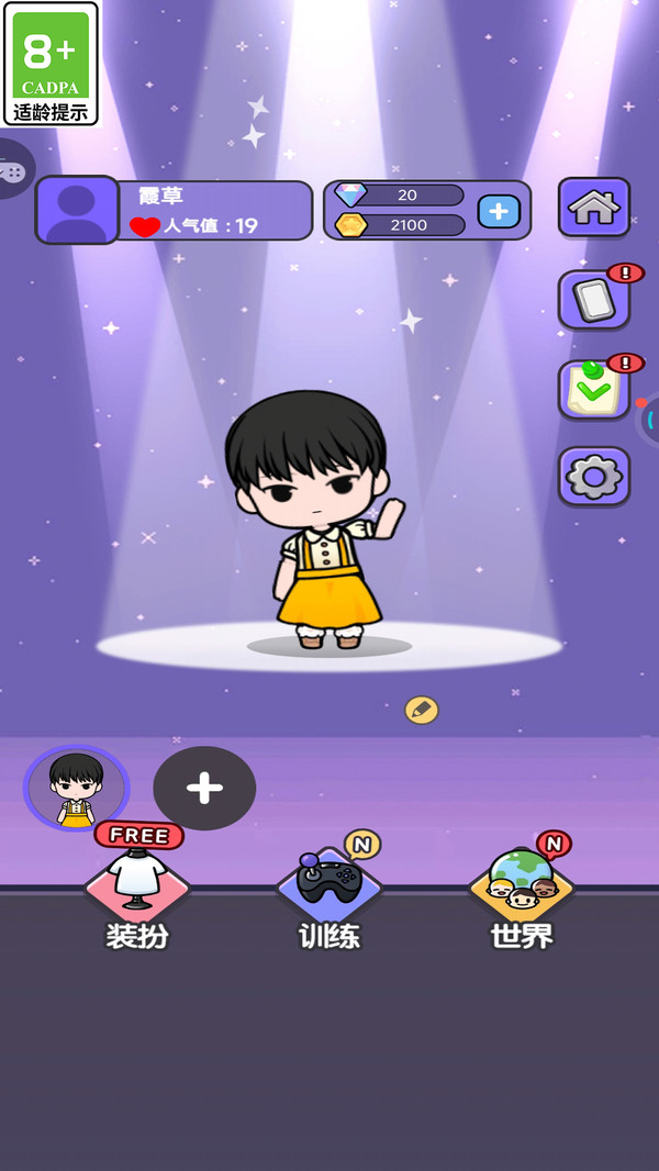 1、进入游戏后,选择心仪的玩法模式,以女团练习册为例,跟随新手引导熟悉操作,了解装扮与人气值的关联。