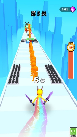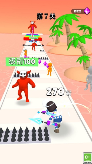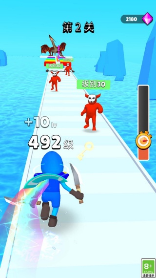 1、开局按 “滑动奔跑” 提示操控角色移动,优先避开路上的尖刺障碍,同时靠近黄色士兵类目标,通过击败它们快速积累经验提升等级。