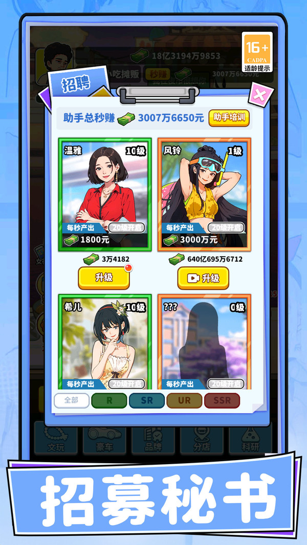 2、招聘助手时优先选择加成比例高的角色,重点培养提升等级,解锁更高收益加成,减轻操作压力。