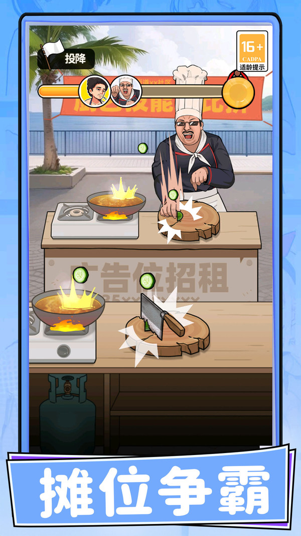 4、持续点击屏幕操作菜刀切菜,积累财富用于招聘助手、升级设备、开设分店,拓展美食事业。