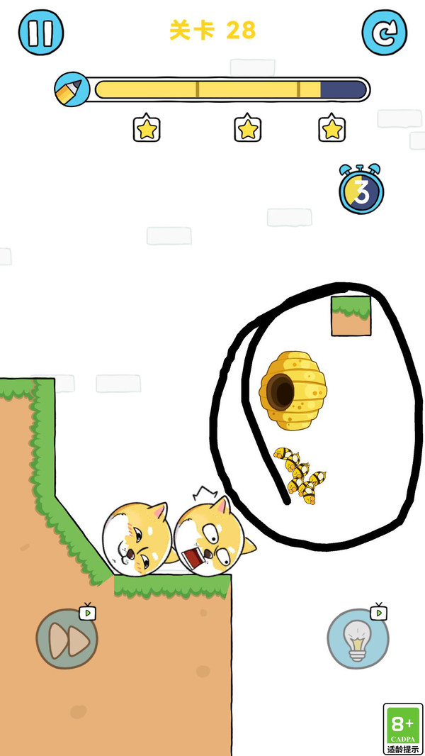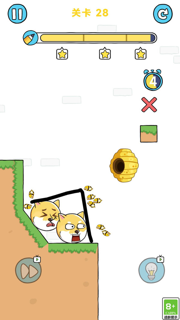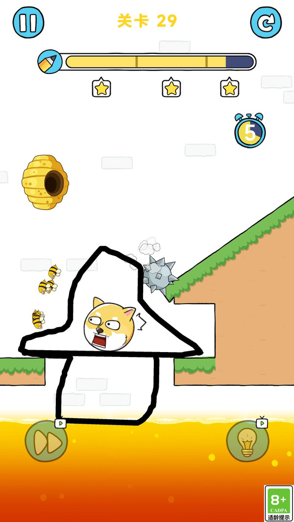 2、用手指在屏幕上自由画线,线条会实体化成为狗狗可行走的道路或阻挡蜜蜂的墙体,完成绘制后启动关卡。