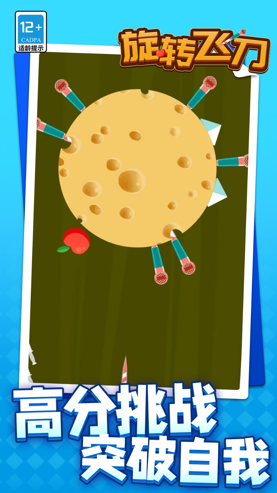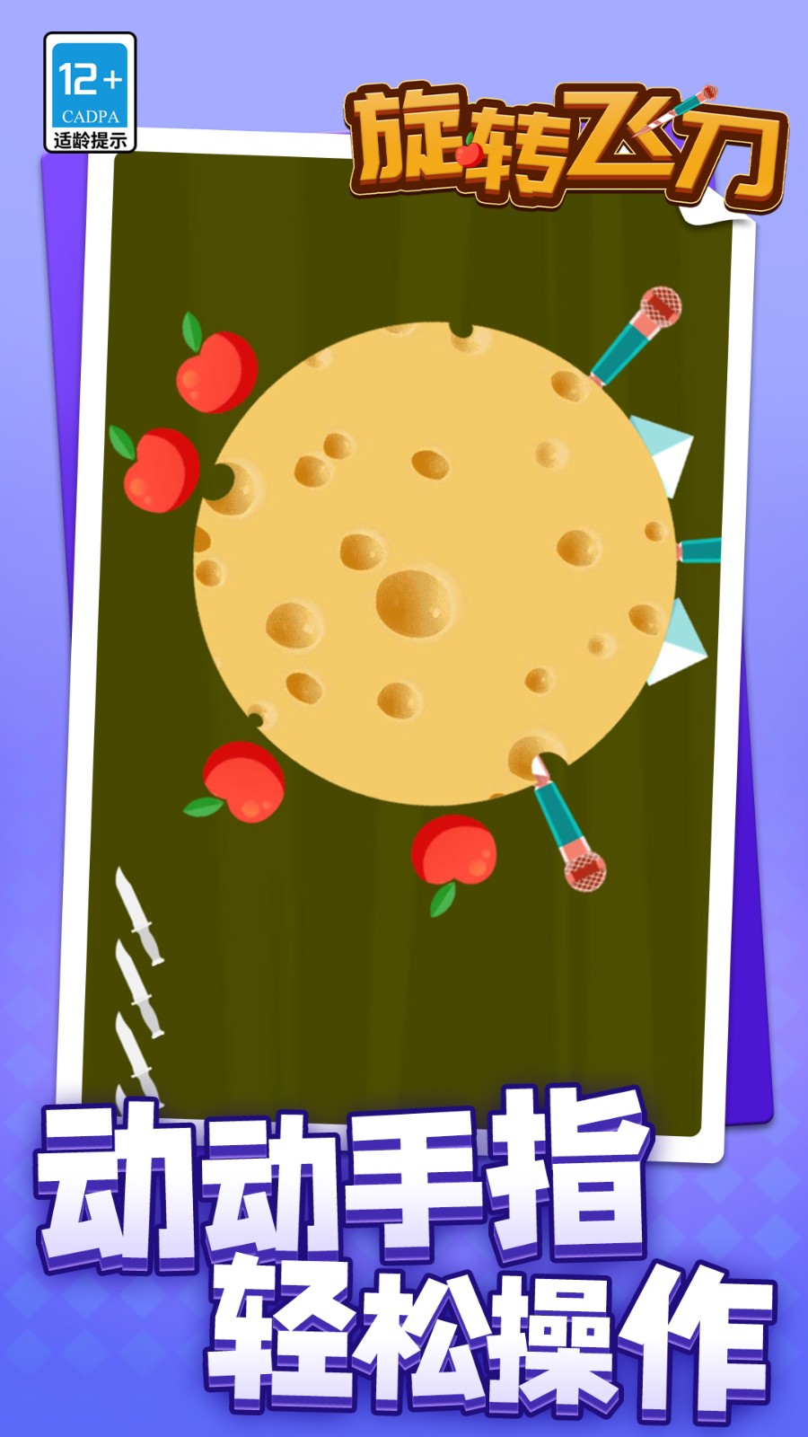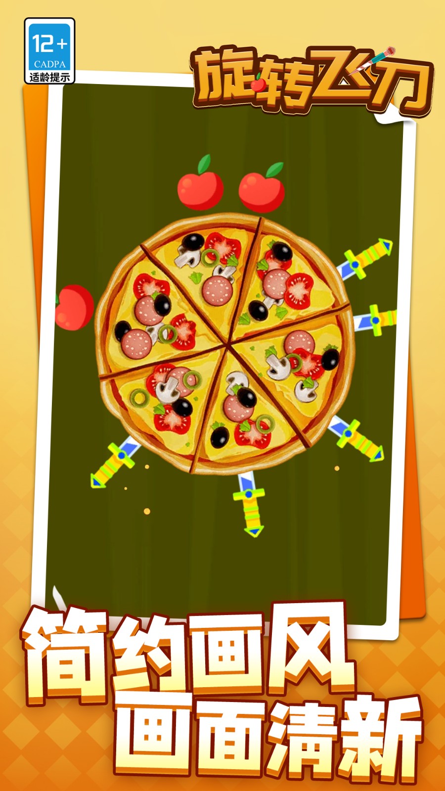 1、点击屏幕即可射出飞刀,瞄准上方旋转的圆盘,精准命中苹果可获得额外奖励。