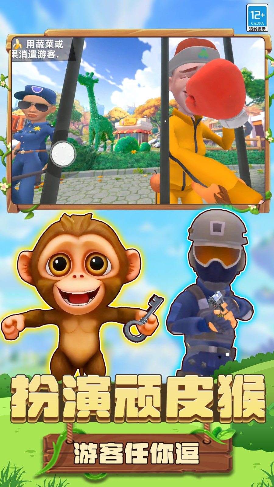 我就是个猴是一款创意十足的休闲恶搞游戏,以第一人称视角让玩家化身动物园里调皮的猴子,打破常规尽情捣蛋, 在猴山鸟馆等细节丰富的场景中,玩家可攀爬探索投掷水果,同时躲避逐步变强的管理员追捕, 积累分数解锁新技能与区域,策划越狱打破束缚的自由与欢乐。