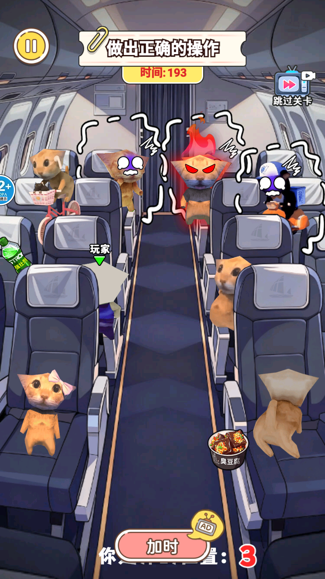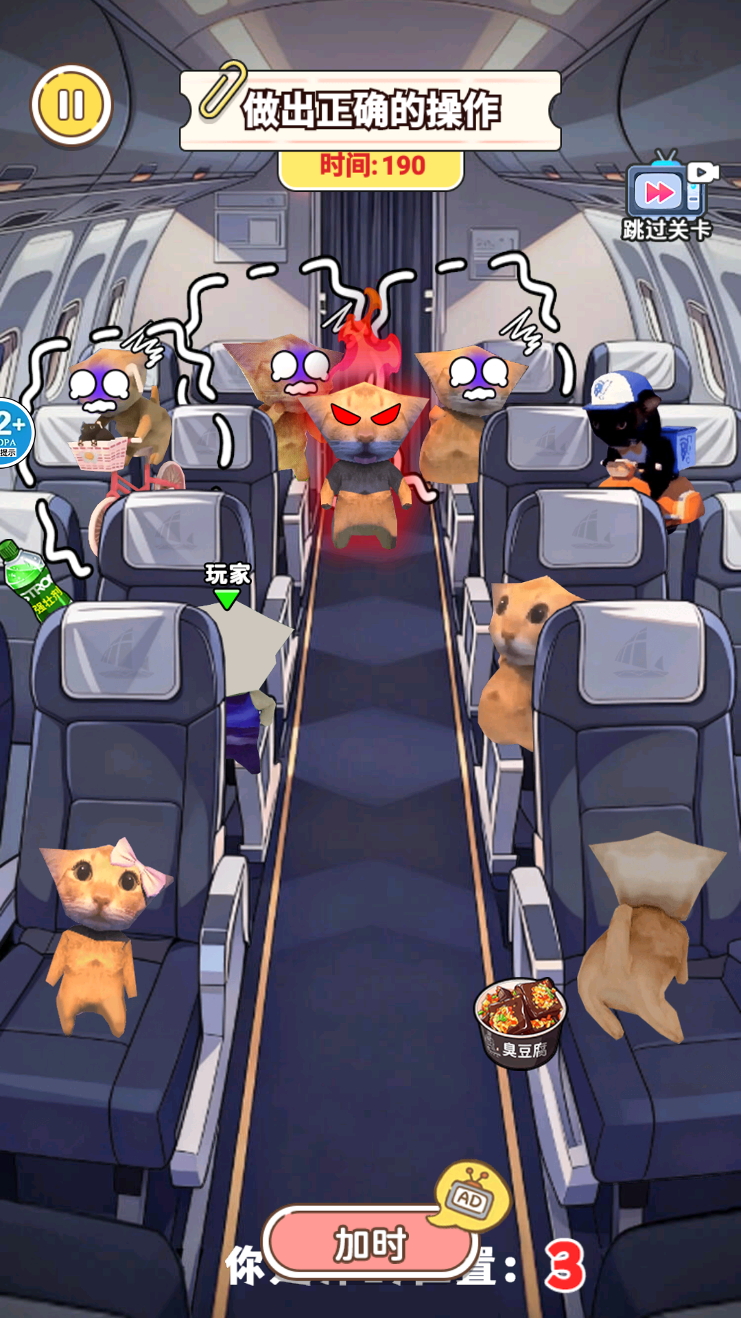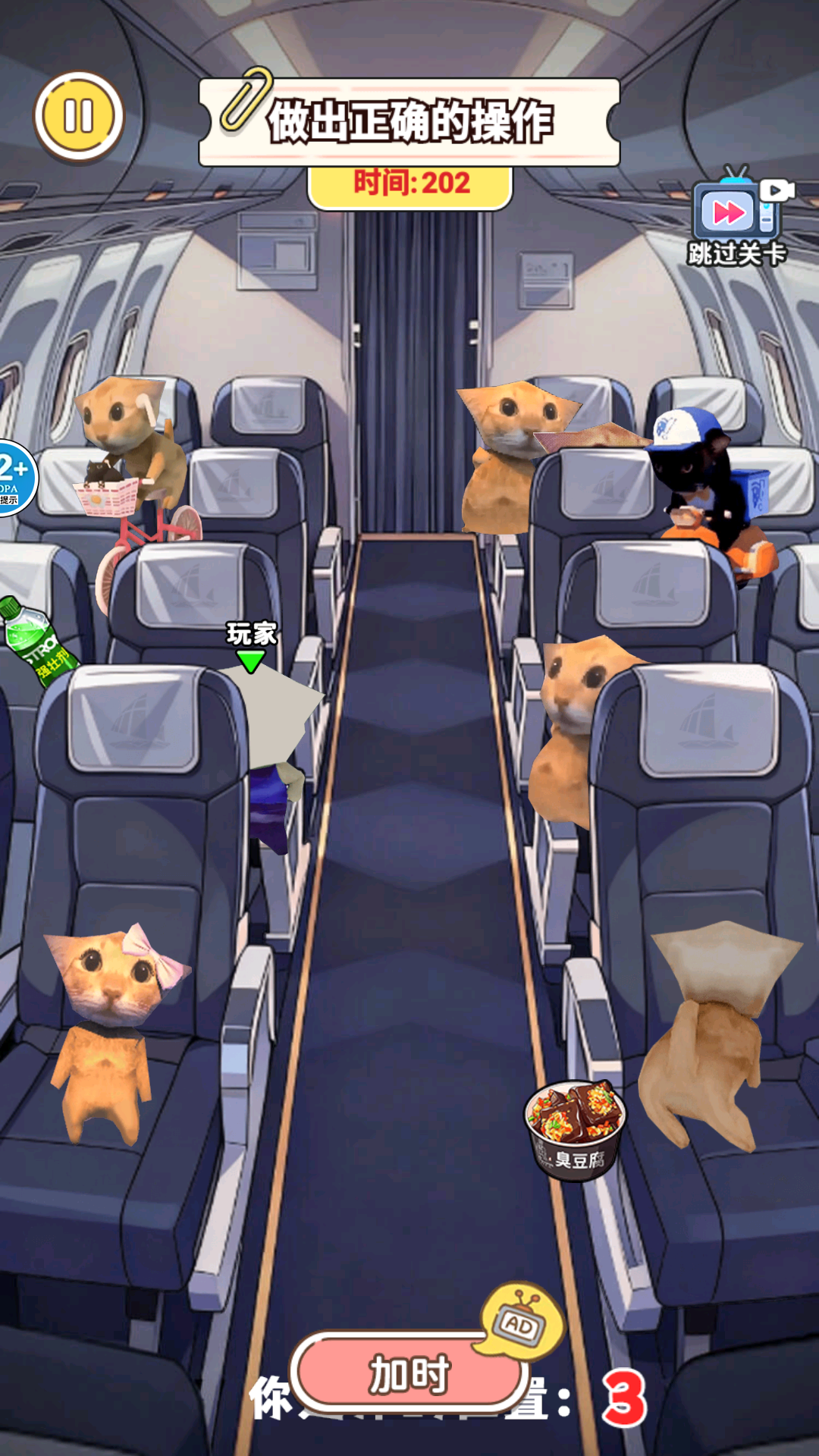 脑洞转圈圈是一款紧张又不失幽默的躲藏冒险游戏,以飞机机舱为核心场景,玩家需灵活利用行李箱餐车等场景道具隐藏自身,躲避邪恶修猫的追捕,随着关卡推进,修猫警惕性与场景复杂度逐步提升, 卡通萌趣画风搭配随机变化的道具与布局,操作简洁却充满未知挑战。