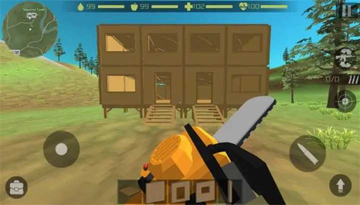1、操控方向键移动至房屋区域,利用背包里的工具收集物资,同时留意状态条及时补充生存资源。
