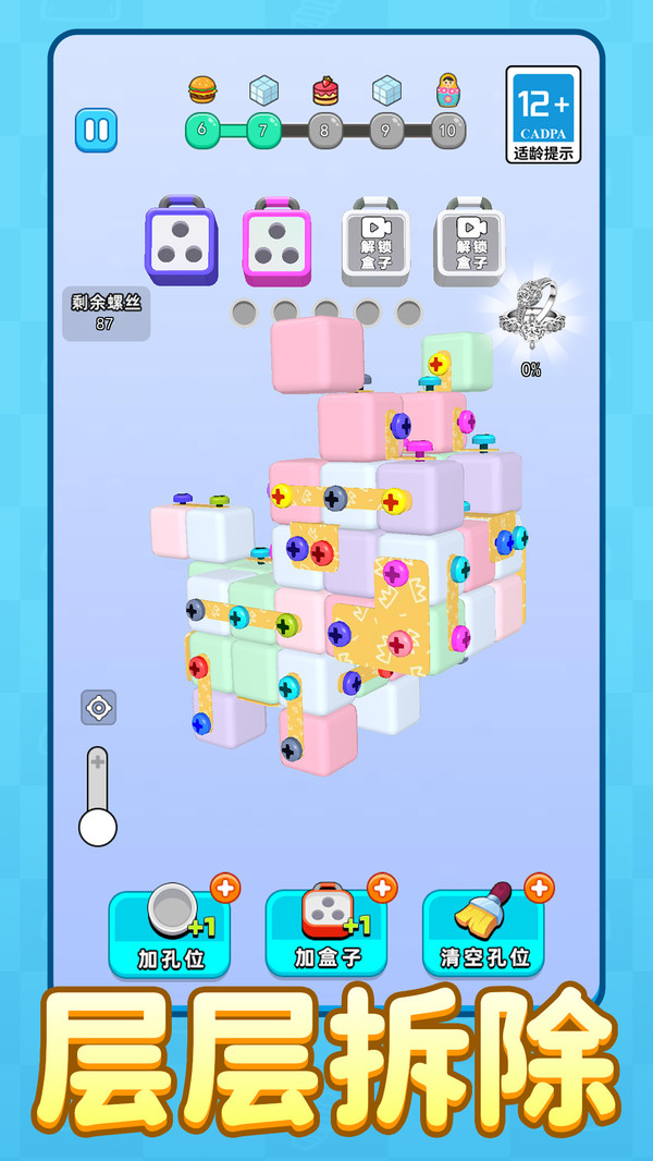 打个螺丝玩免费版是一款以螺丝拆解与组装为核心的休闲益智游戏,玩家需依据关卡中螺丝的布局,合理规划拆卸顺序,将螺丝精准移除并完成组合消除。游戏过程既考验逻辑思维,又能带来动手操作的乐趣。