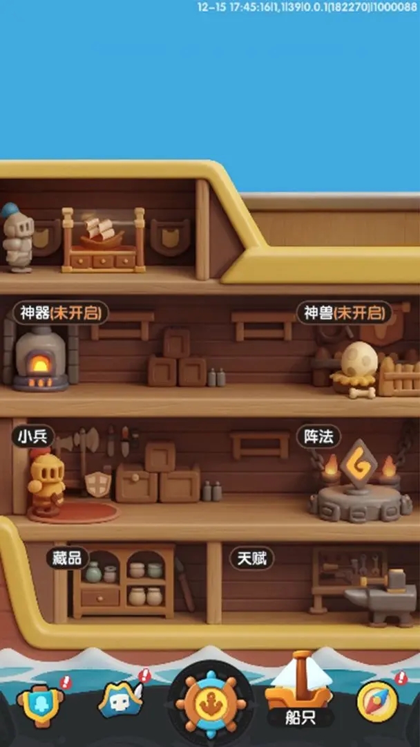 1、进入游戏后点击建造按钮进入船只建造页面,先拾取海上漂浮的木筏与基础材料,搭建初始生存平台,奠定基地建设基础。