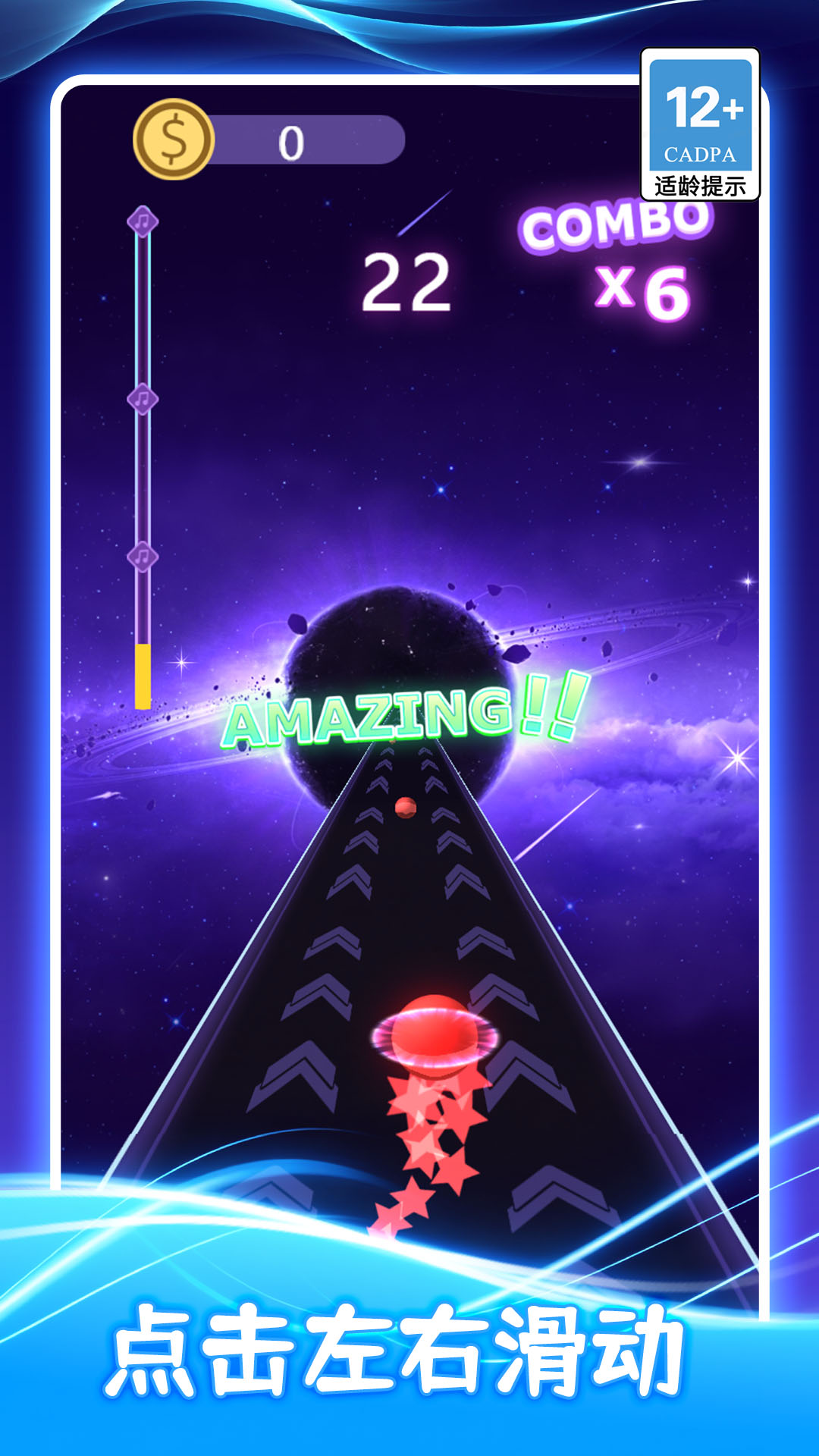 1. 玩家通过左右滑动屏幕来控制音球在行进轨道上的横向移动,精准避开沿途出现的各种动态障碍物。